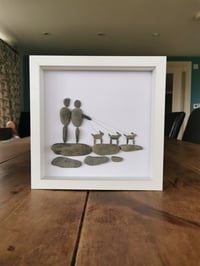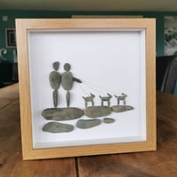 Made out of pebbles to create a two figures taking three dogs for a walk.